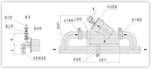 型號 | 管徑 (mm) | 過濾流量 (m3/h) | 過濾面積 (cm3) | 排污閥DN (mm) | 一次清洗 水量(L) | 電機功率 (KW) | 重量 (Kg) | D (mm) | A (mm) | A (mm) | B (mm) | C (mm) | C (mm) | L (mm) | G (mm) |
