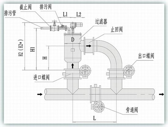 型號 | 管徑 (mm) | 過濾 流量 (m3/h) | 過濾 面積 (cm2) | 排污 閥DN (mm) | 一次清 洗水量 (L) | 電機 功率 (KW) | 重量 (Kg) | D (mm) | H (mm) | H1 (mm) | H2 (mm) | H2 (mm) | L1 (mm) | L2 (mm) | L (mm) |