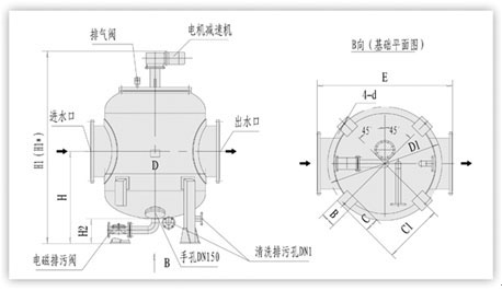 型號 | 管徑 mm | 過濾 流量 m3/h | 過濾面積 cm2 | 電磁排污閥DN1 mm | 一次清洗水量L | 清洗排污閥DN1 mm | 電機功率 KW | 重量 Kg | D mm | H mm | H1 mm | H1 mm | H2 mm | E mm | D1 mm | B mm | C mm | C1 mm | D mm |